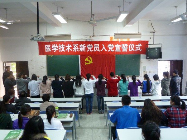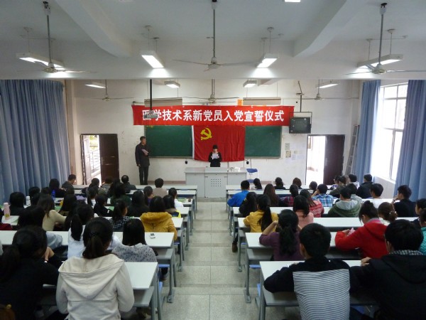 2013 年3月 12日下午,醫(yī)學(xué)技術(shù)系黨總支在系第一階梯教室進行新黨員入黨宣誓儀式。儀式由洪聿榮書記主持,到會的還有系黨總支委員、黨支部書記和各班級輔導(dǎo)員。