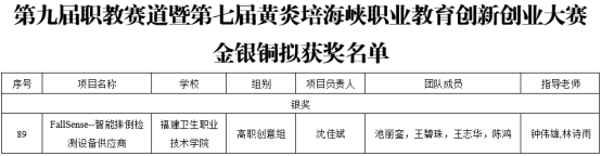 2023年7月31日至8月1日,第九屆福建省“互聯(lián)網(wǎng)+”大學生創(chuàng)新創(chuàng)業(yè)大賽職教賽道暨第七屆黃炎培海峽職業(yè)教育創(chuàng)新創(chuàng)業(yè)大賽在黎明職業(yè)大學舉行。我校報送的參賽項目《FallSense--智能摔倒檢測設(shè)備供應商》在省賽網(wǎng)評中勝出,參加本次現(xiàn)場決賽并獲得銀獎。