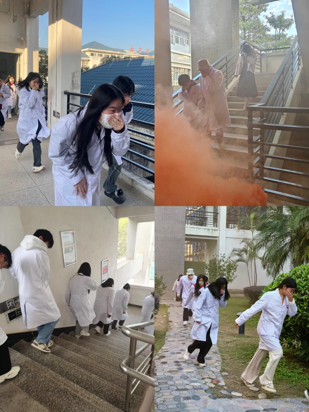 演練中,平靜的院部樓突然黃煙四起、警哨吹響。老師迅速到達(dá)指定崗位,在現(xiàn)場(chǎng)人員的指揮下,學(xué)生紛紛用隨身衣物、濕紙巾、手等捂住口鼻,彎腰從預(yù)定的逃生路線撤離,撤退過(guò)程井然有序。