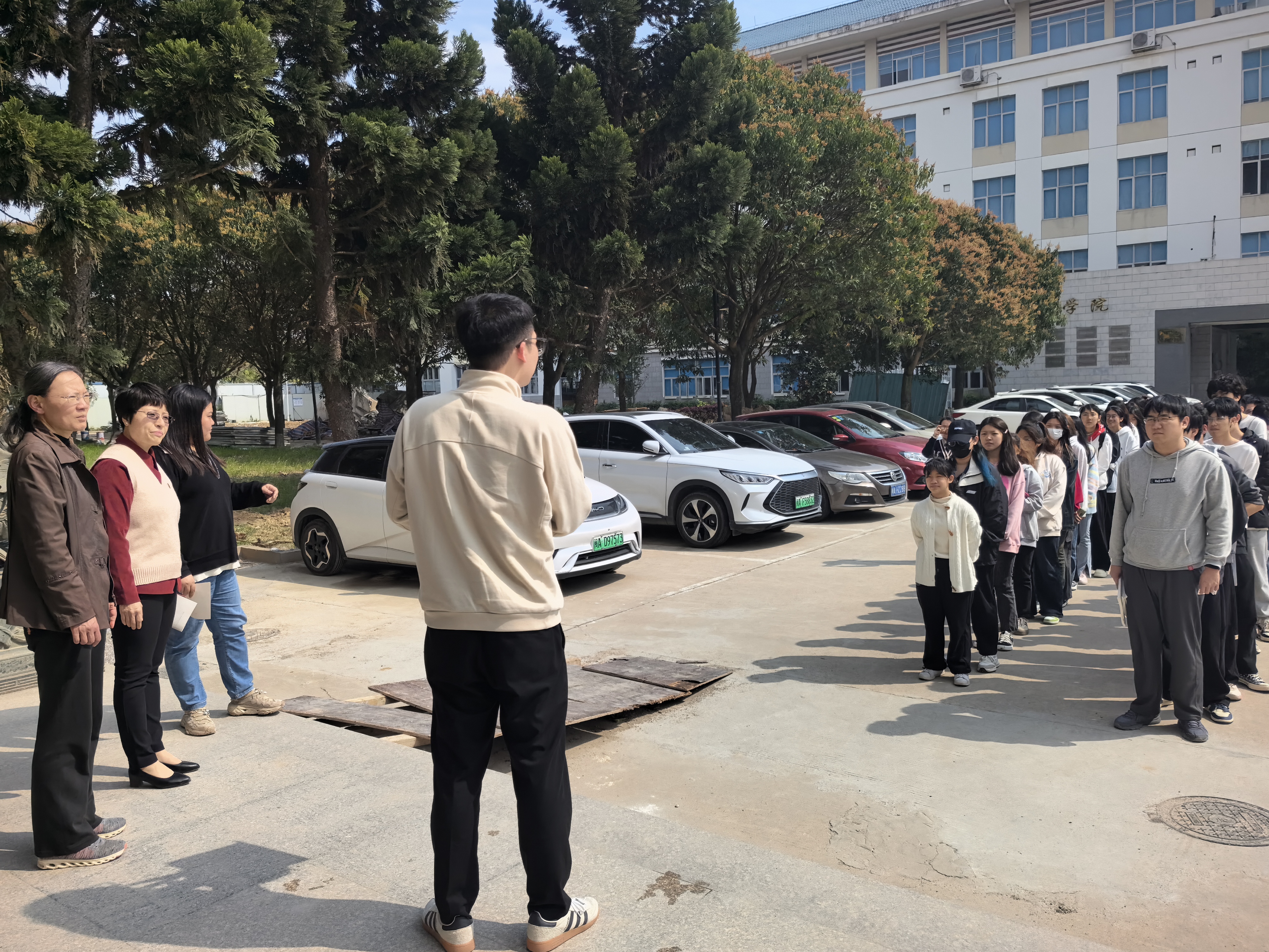 第二部分應(yīng)急逃生演練(消防、地震)。演練開啟前安全工作處林澤文先詳細介紹消防器材的使用、演練程序、疏散信號、疏散路線、疏散順序等注意事項,并強調(diào)在疏散過程中切勿擁擠、推搡導(dǎo)致踩踏事件發(fā)生。演練工作組接到演練指令后,燃放煙霧,平靜的系部樓突然黃煙四起、警報鈴響,各位老師迅速到達指定崗位,學(xué)生們也隨之做出反應(yīng),在現(xiàn)場人員的指揮下,學(xué)生們紛紛用手、濕紙巾等捂住口鼻,彎著腰從預(yù)定的逃生路線進行撤離,撤退中所有同學(xué)緊靠右行,撤退過程井然有序,參加本次演練師生全部安全撤離到指定區(qū)域。