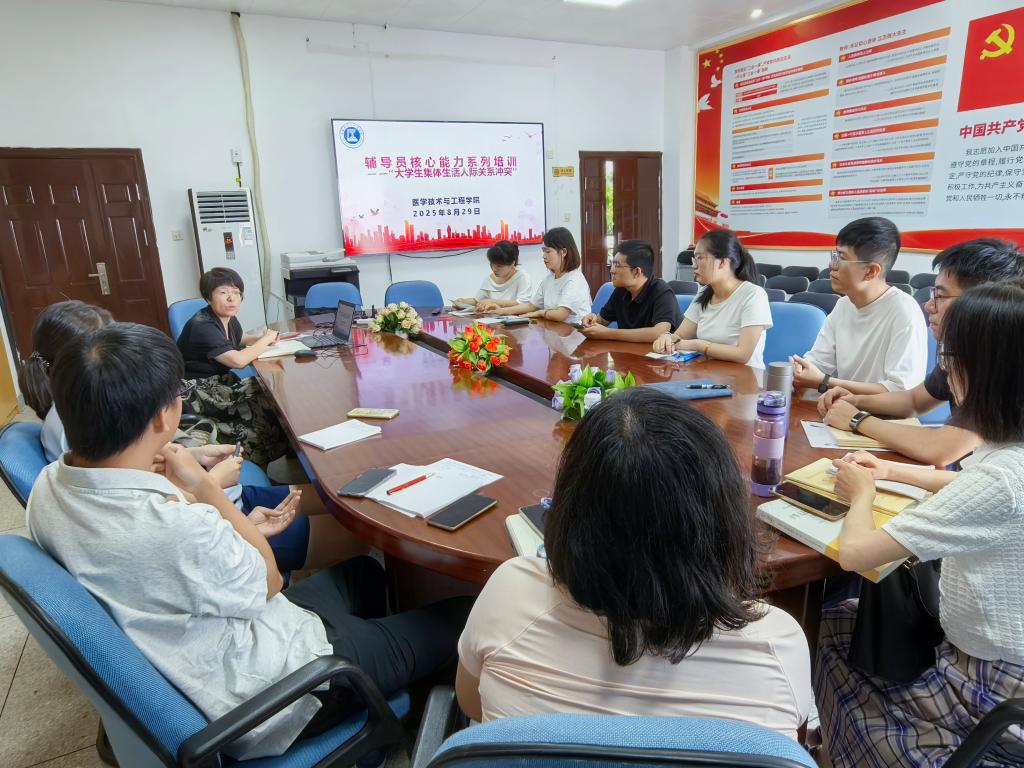 為全面貫徹習(xí)近平新時(shí)代中國特色社會主義思想和全國高校思想政治工作會議精神,進(jìn)一步落實(shí)《全面加強(qiáng)新時(shí)代高校輔導(dǎo)員隊(duì)伍建設(shè)行動方案》文件要求,加強(qiáng)我院輔導(dǎo)員隊(duì)伍專業(yè)化、職業(yè)化建設(shè),提升輔導(dǎo)員的核心能力,醫(yī)學(xué)技術(shù)與工程學(xué)院按照輔導(dǎo)員核心能力提升內(nèi)訓(xùn)行動計(jì)劃方案,于8月29日舉辦輔導(dǎo)員核心能力培訓(xùn)第三課。全體專兼職輔導(dǎo)員參加了此次培訓(xùn)。