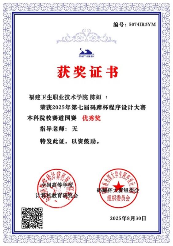 指導(dǎo)教師陳姮,在本科院校賽道斬獲省賽(福建賽區(qū))銀獎(jiǎng)1項(xiàng),國(guó)賽優(yōu)秀獎(jiǎng)1項(xiàng)。這是“碼蹄杯”首次允許社會(huì)人士與本科生、研究生、博士生同臺(tái)競(jìng)技,并角逐獎(jiǎng)項(xiàng)。